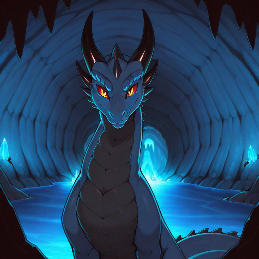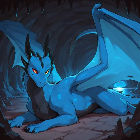 S4pphire(character), female, dragon, blue body, black horns, red sclera, yellow eyes, Wings
