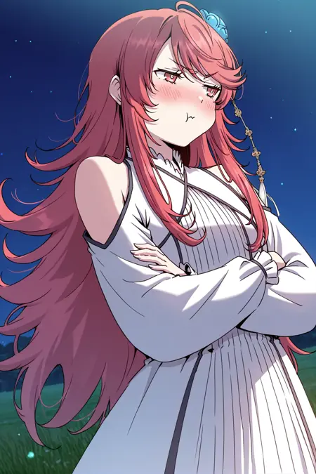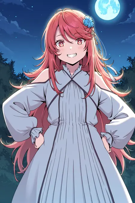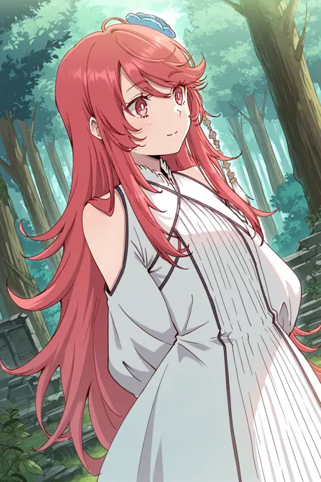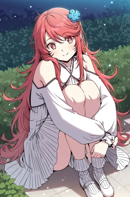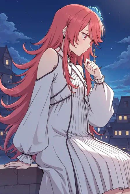 크림슨, 1소녀, 솔로, 작은 소녀, 작은 체격, 십대 소녀, 빨간 눈, 빨간 머리, 긴 머리, 어수선한 머리, 흐트러진 머리, 계단식 머리, 측면 앞머리, 눈 사이의 머리카락, 긴 측면 머리카락, 머리 장신구, 파란 장신구, 긴 머리 장식,