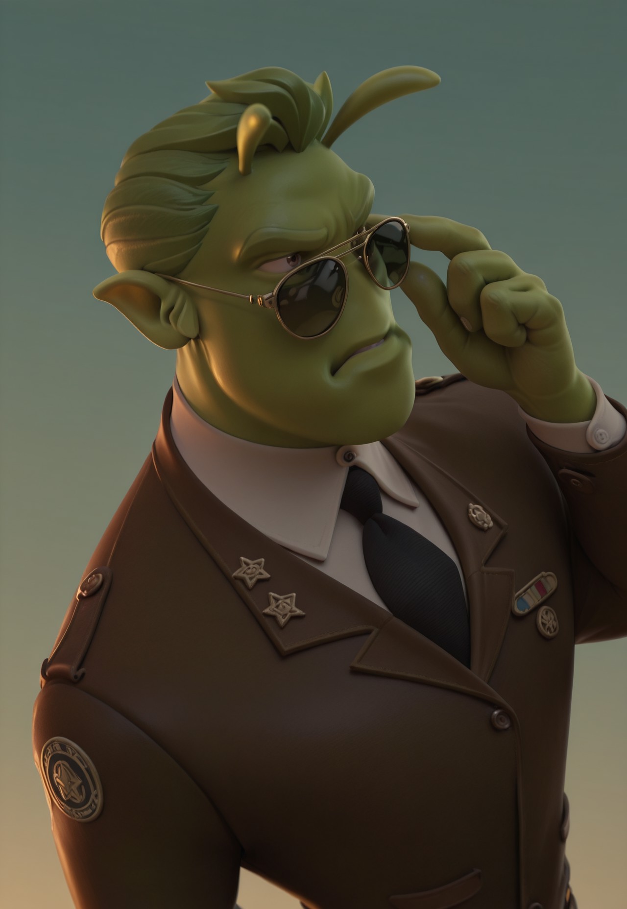 brown jacket, millitary uniform, collared shirt, black necktie, badge, brooch
