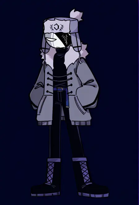 RuvFNFMFM, 1boy, white skin, gray skin, white body, white sclera, no pupils, eyepatch, fur trim, gray and black coat, open coat, long sleeves, dark blue undershirt, dark blue turtleneck, dark blue belt, dark blue pants, noseless,