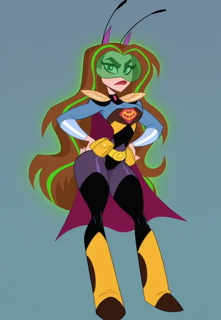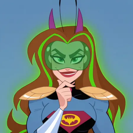 | 训练词汇 | 1girl, solo, dcshgMCK, extremely long hair, glowing hair, brown hair, streaked hair, antennae, purple horns, green eyes, green visor, lipstick, pauldrons, golden pauldrons, shoulder armor, shoulder pads, cape, silver bracers, yellow belt, utility belt, blue shirt, multi-colored bodysuit, black leotard, purple pantyhose, bat symbol, black thigh highs, yellow knee boots, red pendant,已复制! |