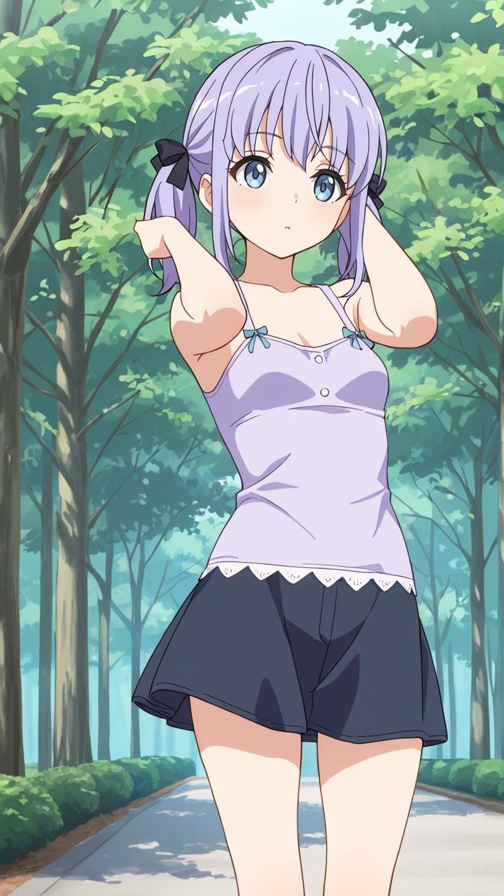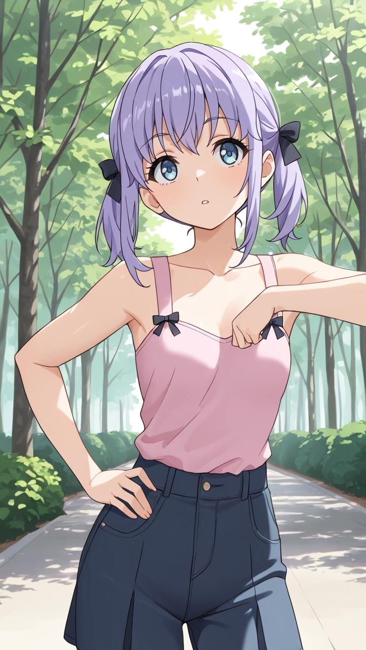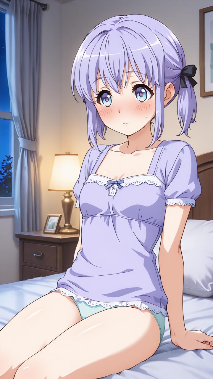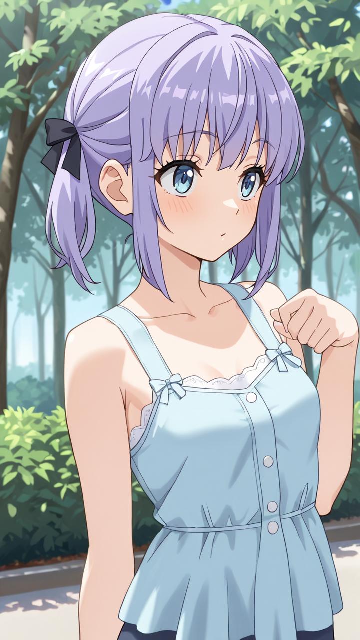 YukiMisono, blue eyes, lilac hair, short hair, hair bangs, sidelocks, twintails, black hair ribbon, small breasts
