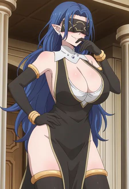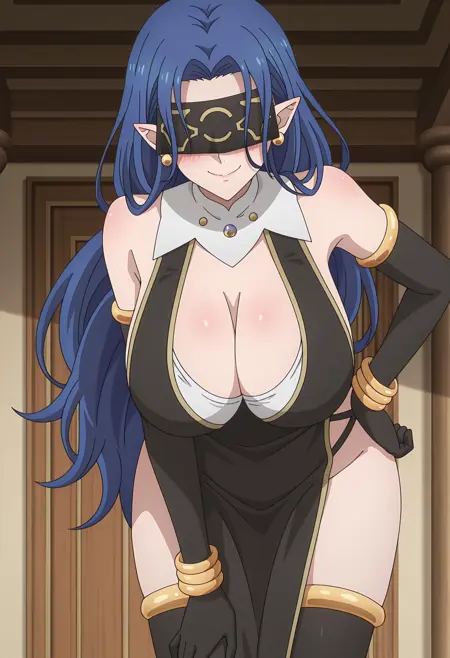 fgknkur, 긴 머리, 파란 머리, 뾰족한 귀, 큰 가슴, 눈가리개, 귀걸이,