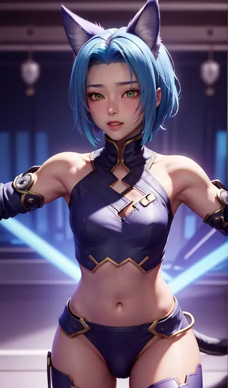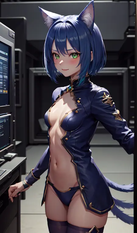 short hair, thighhighs, gloves, animal ears, green eyes, blue hair, tail, cat ears, headband, toeless legwear, stirrup legwear, small breasts, purple panties, navel, jewelry