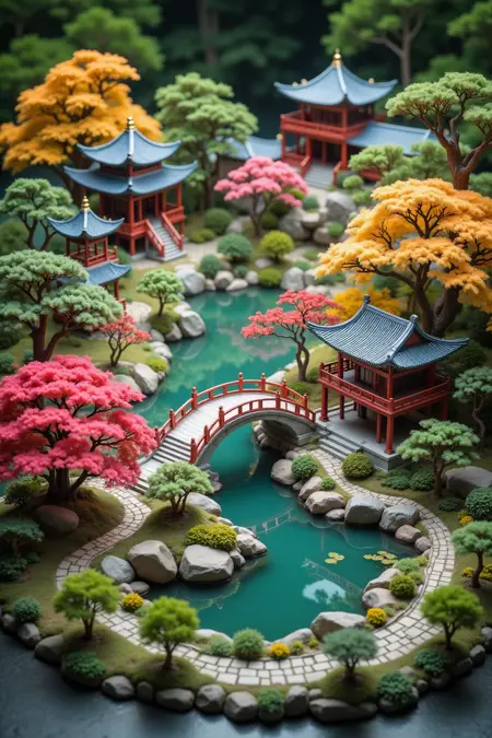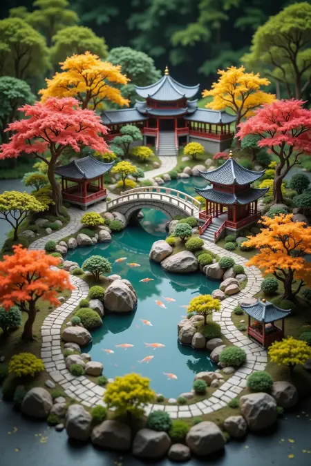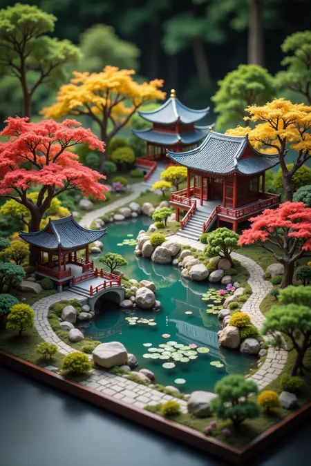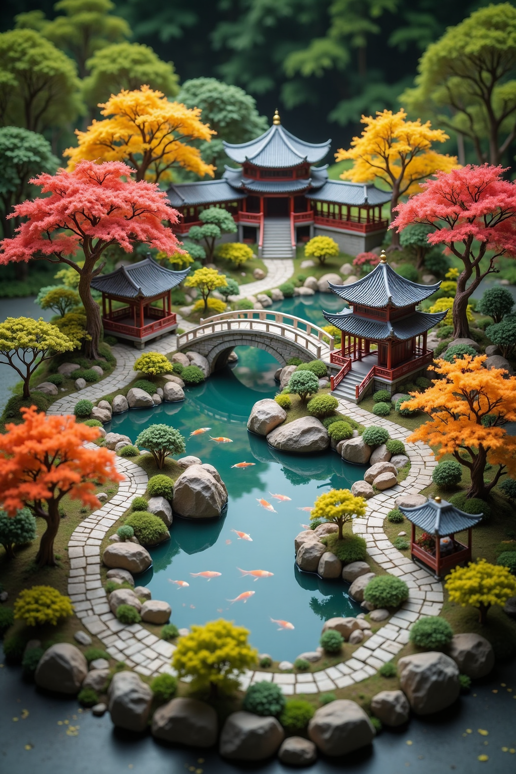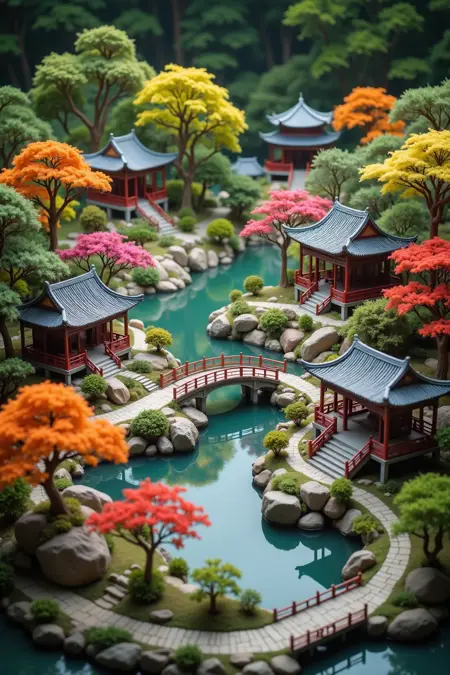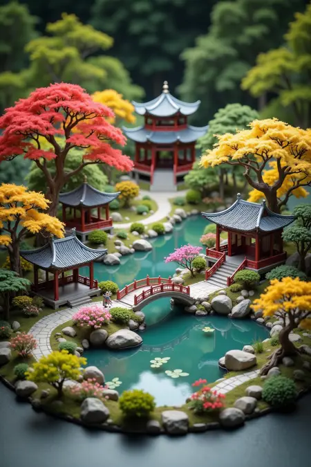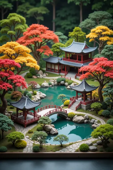 ミニチュア中国庭園風景、pagodas と pavilions、アーチ型の橋、鮮やかな色の木々、池、芸術的な味わいに満ちている。