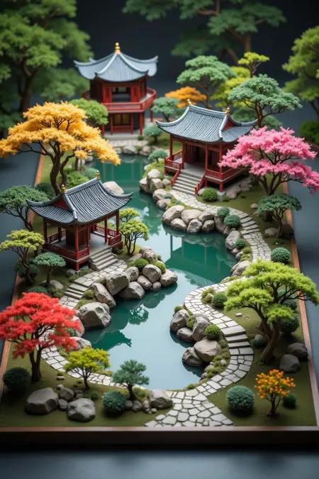 ミニチュア中国庭園風景、伝統的な pavilions、石敷きの小道、色とりどりの木々、小さな湖、古典的な美を表現。
