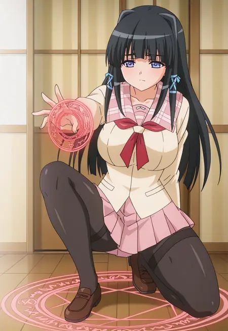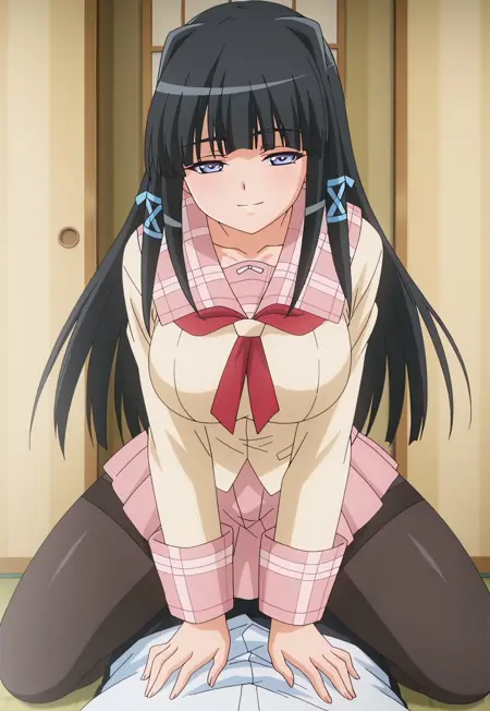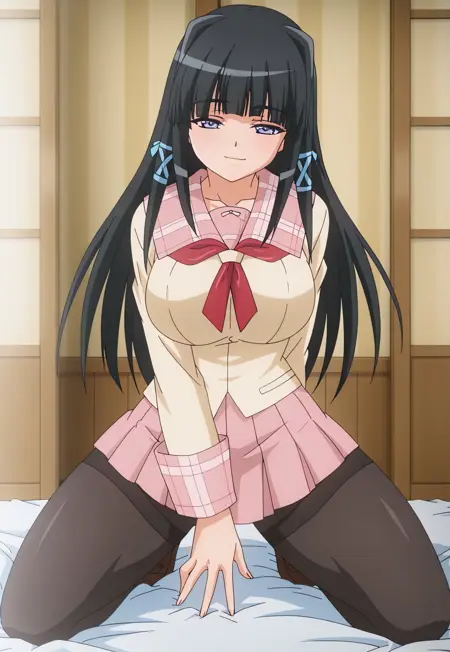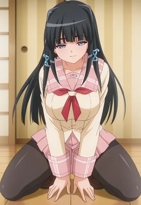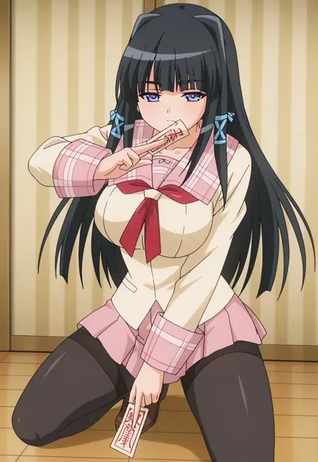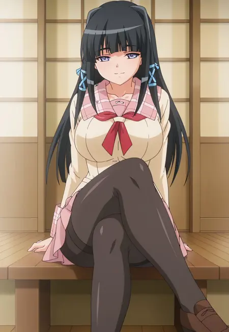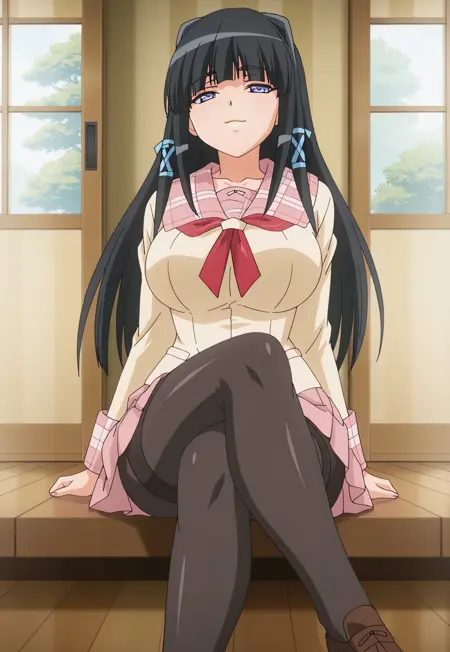 Tagging words : black hair, long hair, bangs, sidelocks, hair ribbon, tress ribbon, ribbon, purple eyes, large breasts, serafuku, school uniform, skirt, pleated skirt, pantyhose, black pantyhose, thighband pantyhose, panties under pantyhose, polka dot, polka dot panties, underwear, brown footwear