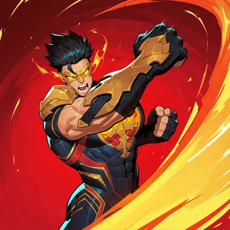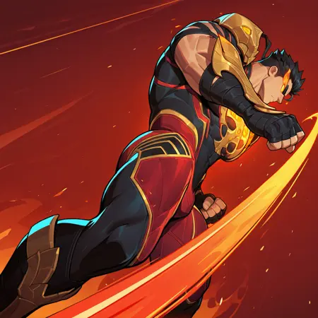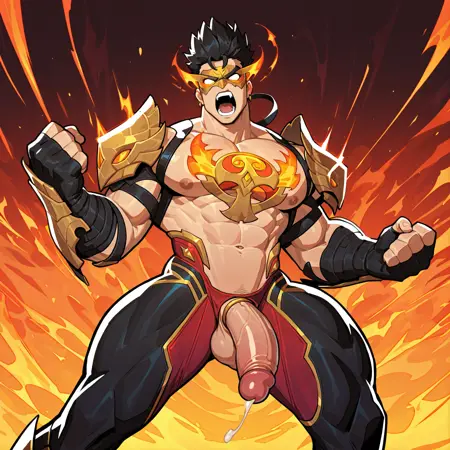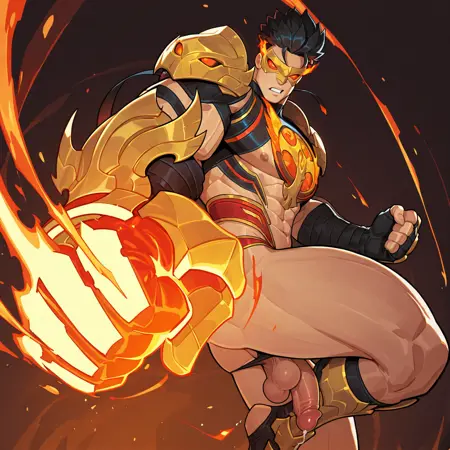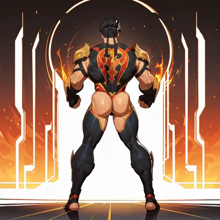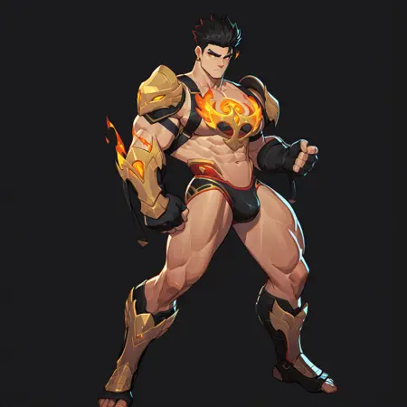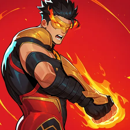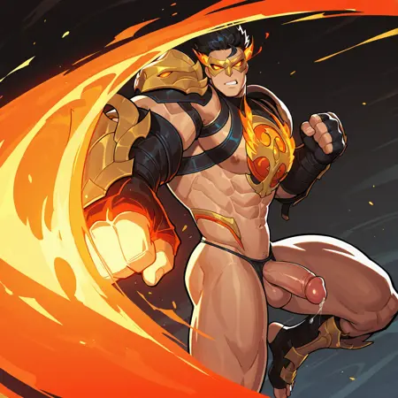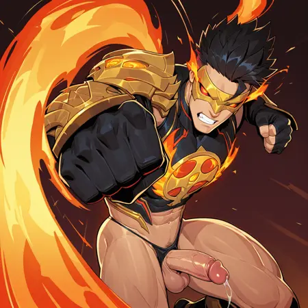 <lora:IRONFIST_PHOENIX:1> ironfist_phoenix, solo, 1boy, male focus, muscular, muscular male, short hair, armor, fire, black hair, gloves, bodysuit, bara, shoulder armor, mature male, fingerless gloves, pauldrons, glowing, thighs, thick thighs, pectorals, skin tight, red bodysuit, spiked hair