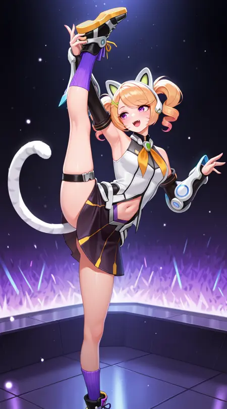 예시 프롬프트: wanwan_egirl, cat_ear_headphones, sleeveless_blouse, neckerchief, detached_sleeves, skirt, leg_belt, purple_socks, black_shoes, armguards, white_striped_tail, navel,