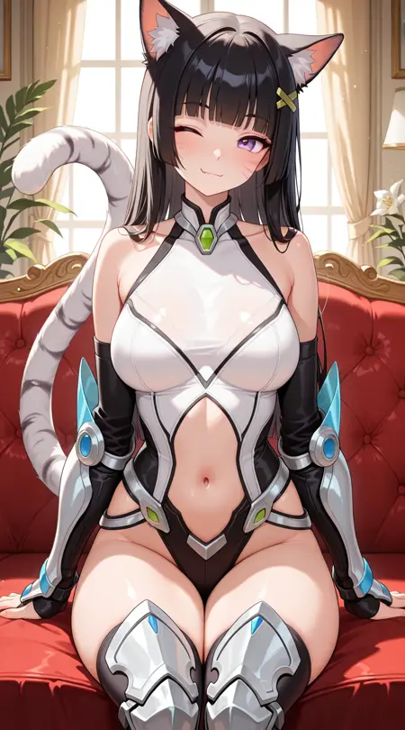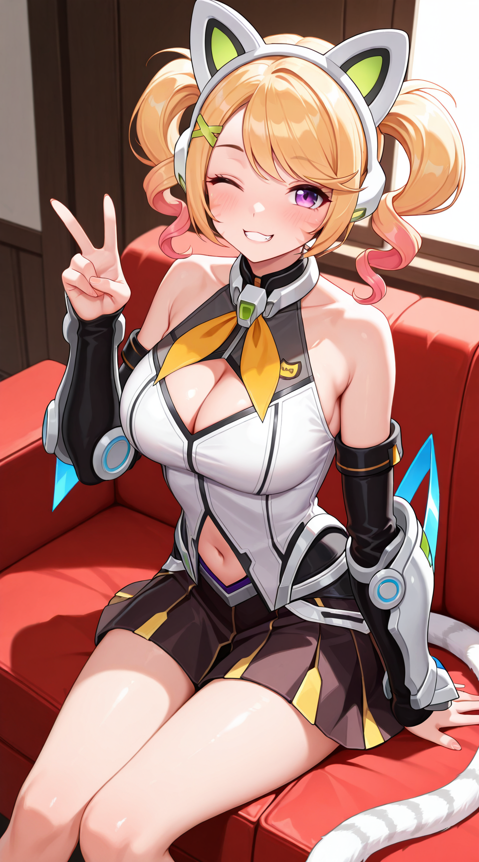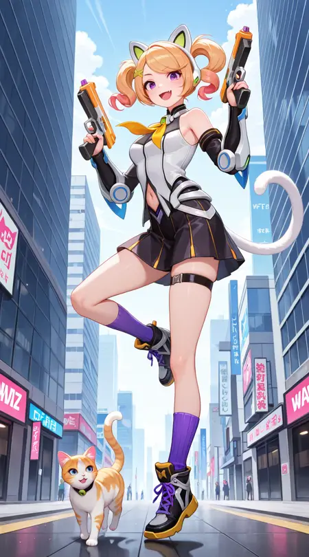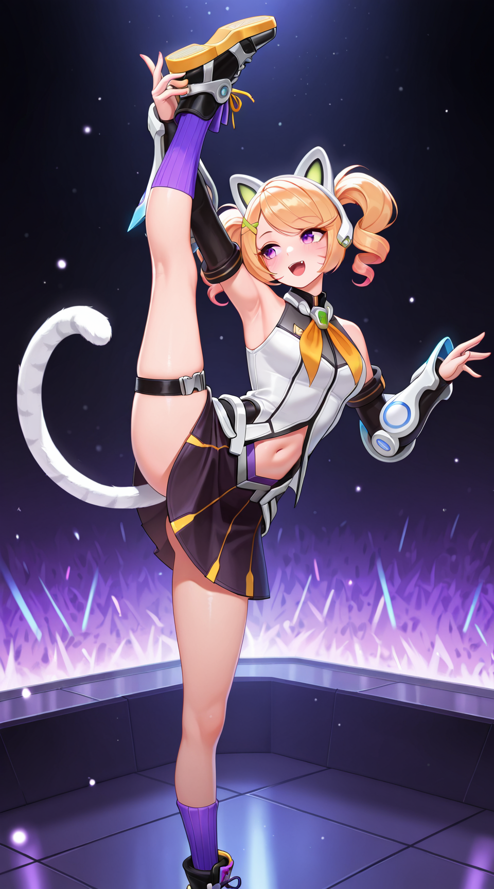 Example Prompt: wanwan_egirl, cat_ear_headphones, sleeveless_blouse, neckerchief, detached_sleeves, skirt, leg_belt, purple_socks, black_shoes, armguards, white_striped_tail, navel,