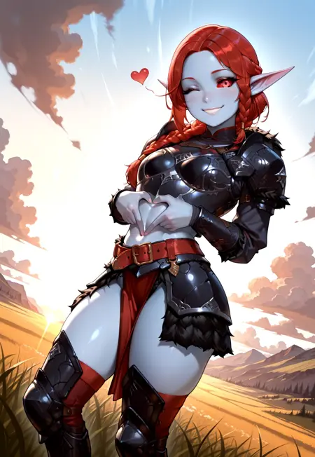 Zyl_Bloodfyre, Zyl'ara Bloodfyre, 판타지, 1girl, solo, 나이트 엘프, 운동적인, 중간 크기 유방, 엘프 귀, 뾰족한 귀, 파란 피부, 회색 피부, 붉은 머리, 땋은 머리, 단일 땋은 머리, 붉은 눈, 붉은 공막, 색깔이 있는 공막,