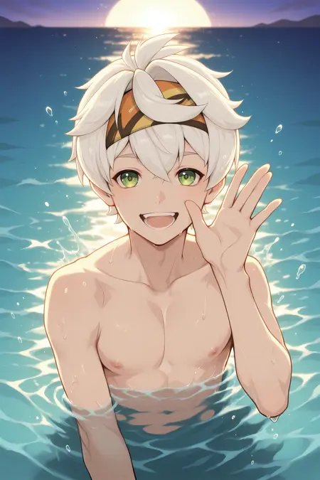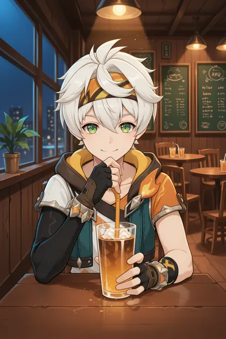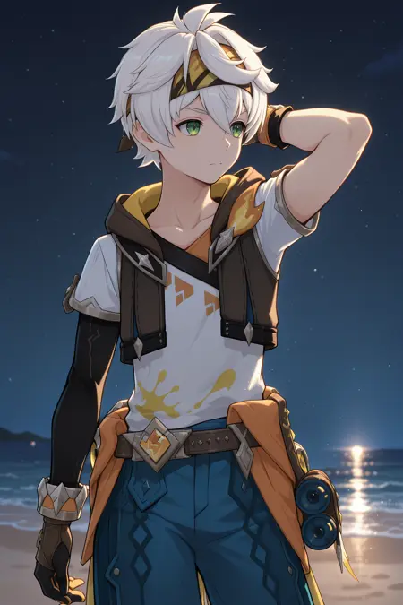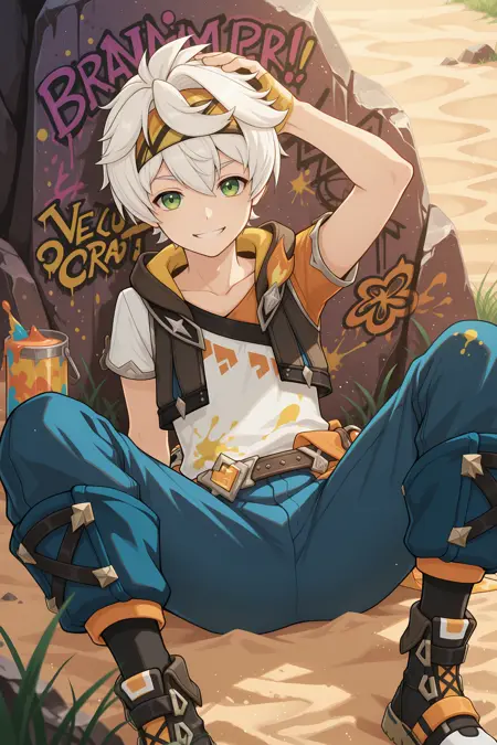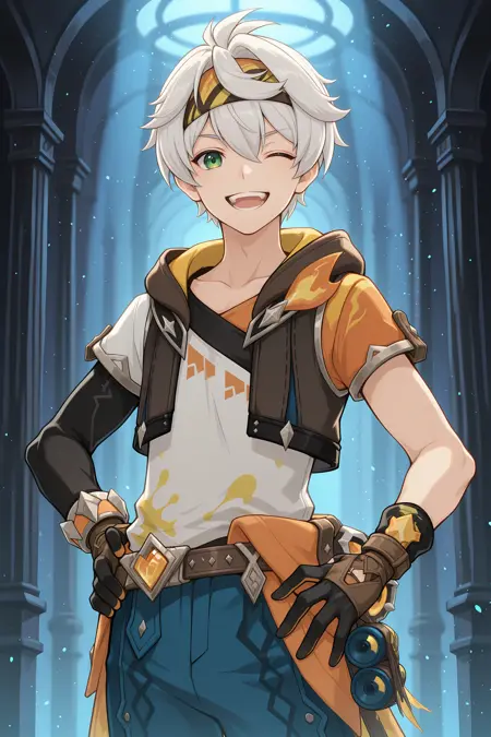 태그: bennett_skin, 녹색 눈, 흰색 머리카락, 눈 사이의 머리카락, 검은 장갑, 손가락 없는 장갑, 이색 장갑, 비대칭 장갑, 팔꿈치 장갑, 갈색 장갑, 주황색 장갑, 후드, 짧은 소매, 흰색 셔츠, 파란색 바지, 검은 신발, 갈색 벨트, 재킷, 헤드밴드
