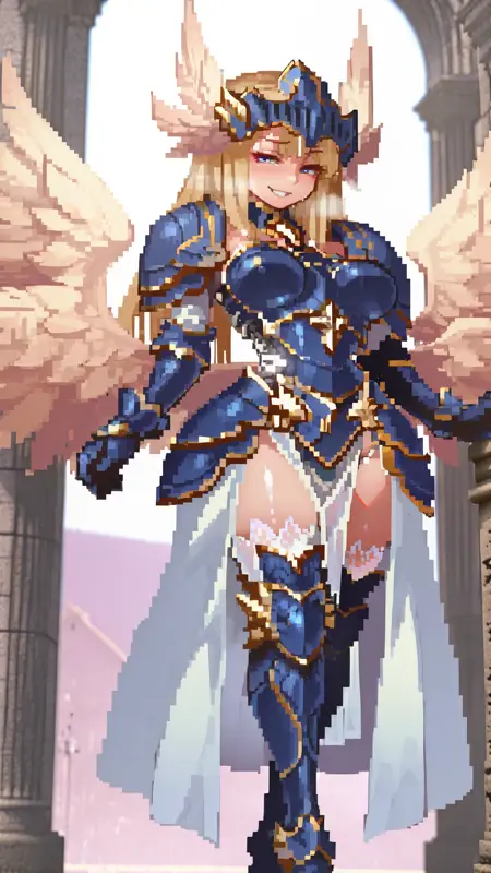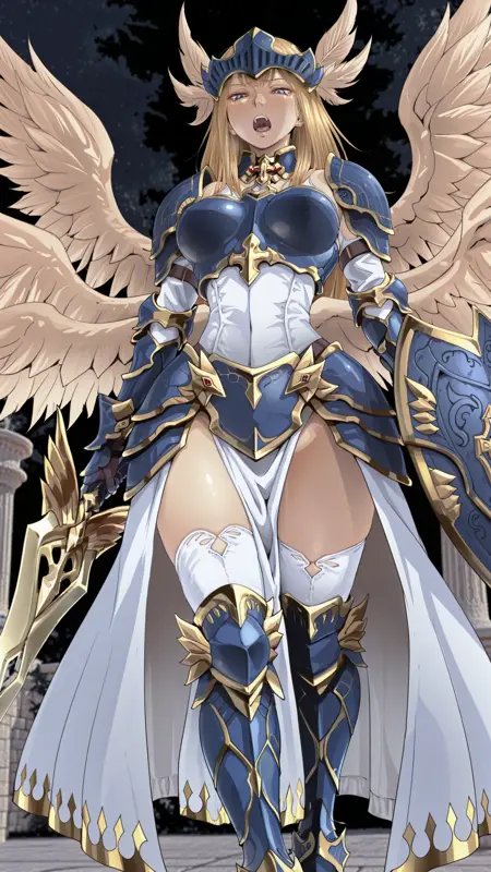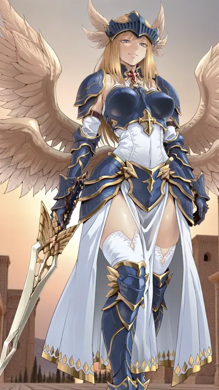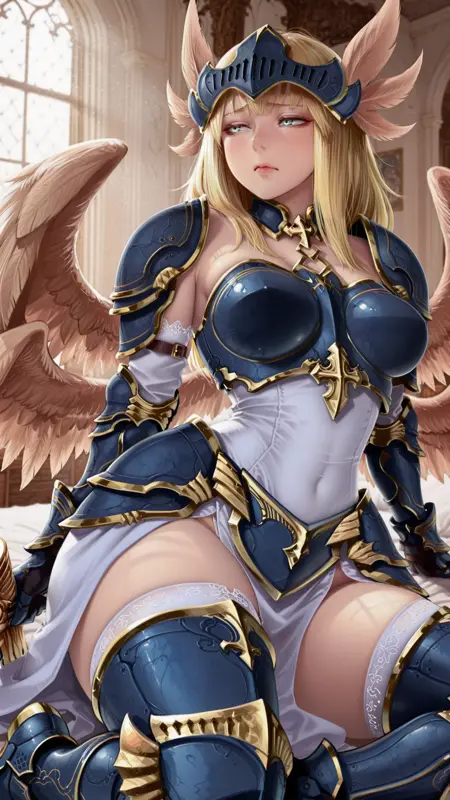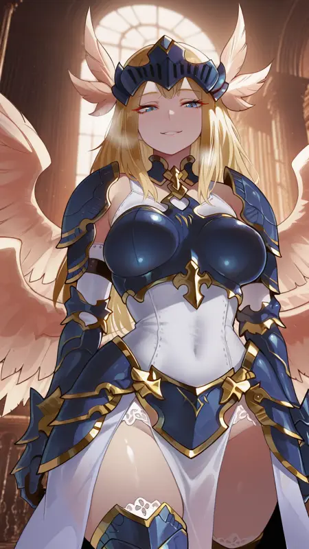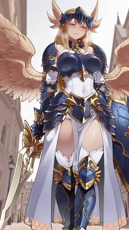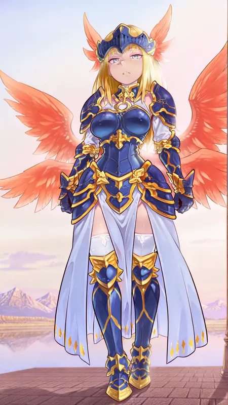 外观: V4lkMG3, 1girl, 蓝色眼睛, 金色头发, 长发, 羽翼, 头部翅膀, 翅膀