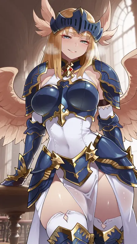 服装: 头盔, 女武神, 蓝色盔甲, 全身铠甲, 胸甲, 乳甲, 臀部帘幕, 肩甲, 手套, 过膝长筒袜, 靴子, 护胫