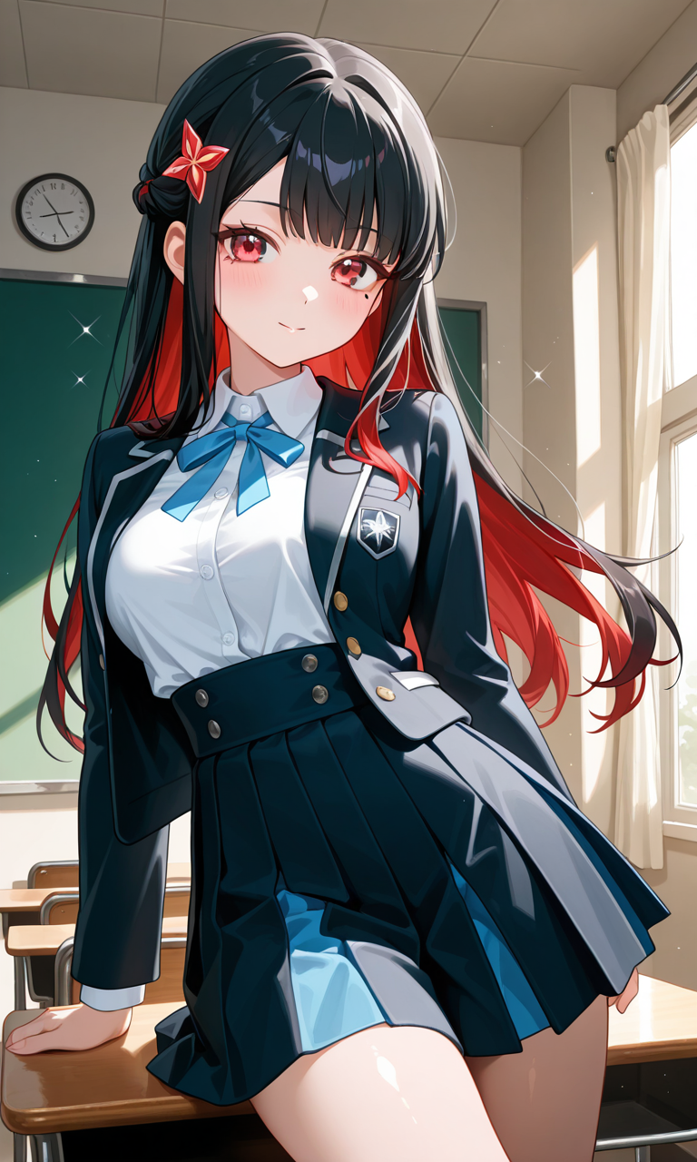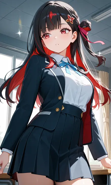 sparkle school, long hair, black hair, red eyes, multicolored hair, hair ornament, mole under eye, mole under each eye,