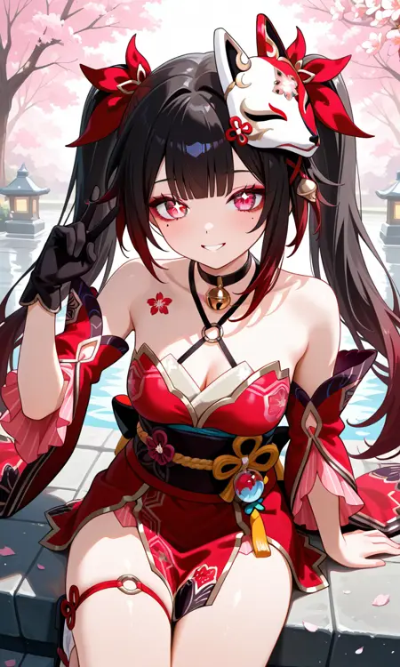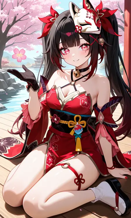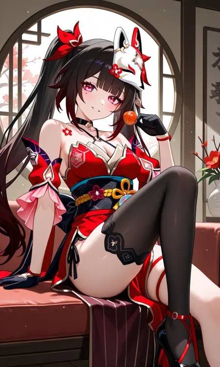 fox mask, mask on head, neck bell,halterneck,o-ring, jingle bell,black choker, criss-cross halter,detached sleeves, (single glove:1.2), red dress, half gloves,black gloves,red kimono,obi,black sash, thigh strap,x hair ornament, zouri,pelvic curtain,
