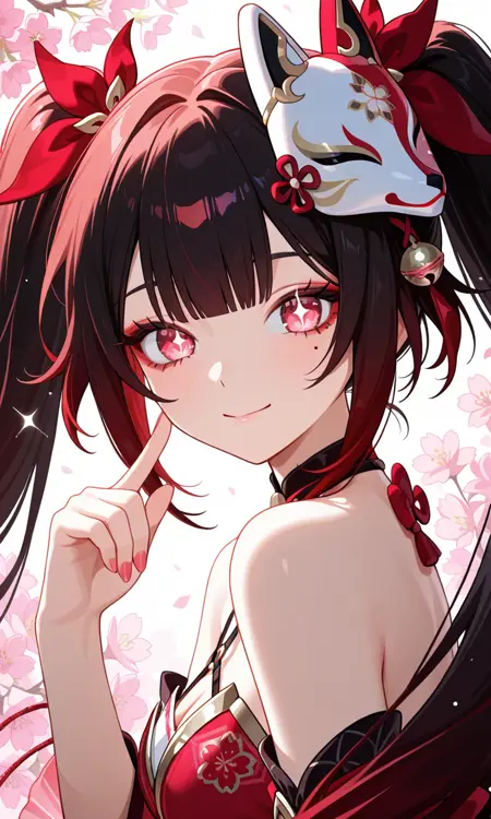 Sparkle, 1girl, magenta eyes, sparkling eyes, cherry blossom iris, black hair, twintails, red mole under eyes, fox mask, mask on head, red hair ribbons