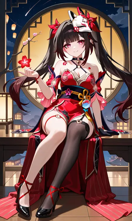 black fox mask, mask on head, black choker, mole under eye, mole under each eye, alternate costume, red and black dress, red dress, bare shoulders, detached sleeves, tattoo, cleavage, black gloves, single glove, black thighhighs, single thighhigh, asymmetrical legwear, black footwear, high heels,