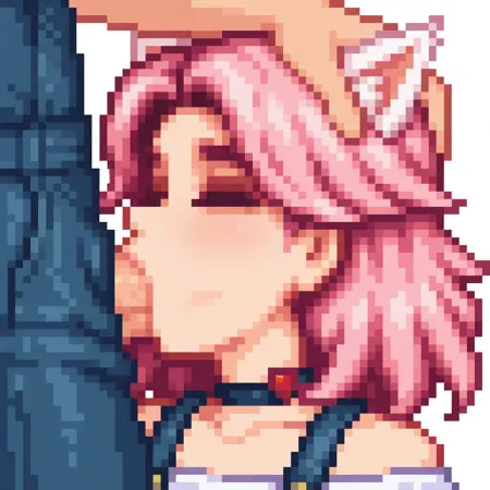 masterpiece, best quality, high quality, 1girl, sophia \(stardew valley\), pink hair, black choker, borderlines, overalls, white shirt, simple background, collarbone, (cute:1.1), pixel art