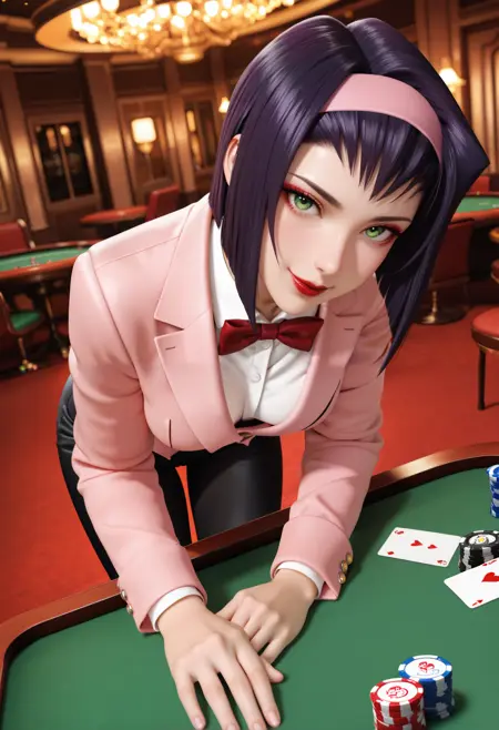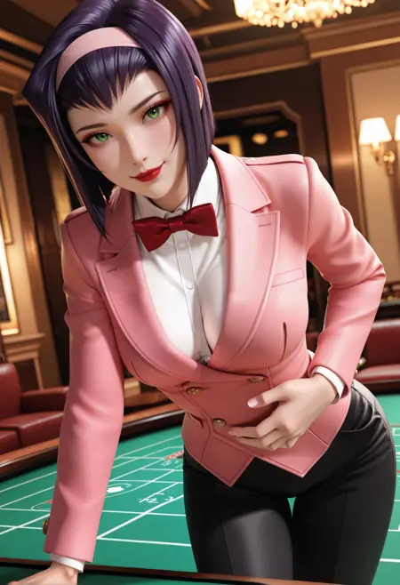 주요 프롬프트: faye valentine, 1girl, solo, large breasts, short hair, purple hair, green eyes, makeup, red lipstick,