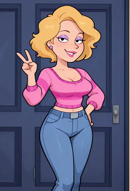 블론드 머리, 보석, 귀걸이, 메이크업, 청바지, 가슴, 바지, 하얀 피부, 곡선미 있는 몸매, 드러난 복부, 끝부분이 곱슬진 어깨 길이의 볼륨 있는 블론드 보브 헤어, 분홍색 풀 립, 작은 코, 보라색 아이섀도, 둥글쭉한 얼굴, 원형 보라색 스터드 귀걸이, 줄무늬와 분홍-보라색 계열의 스쿱 넥 긴 소매 니트 상의, 밝은 청색 테이퍼드 커프 청바지, 플랫한 퍼플 색상의 발레 스타일 슬리퍼