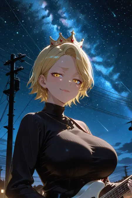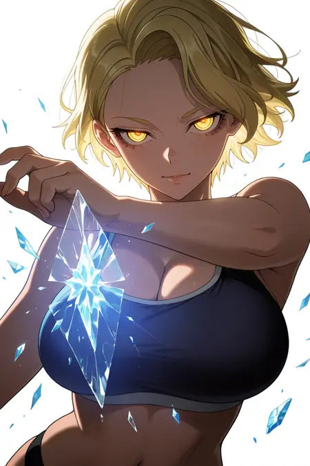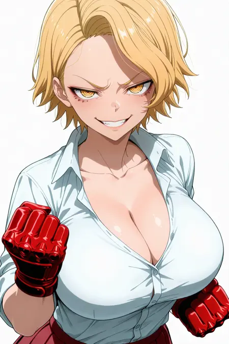 1girl, 단발, 노란 눈, 금발, 큰 가슴, (성숙한 여성, 발달된 몸매)