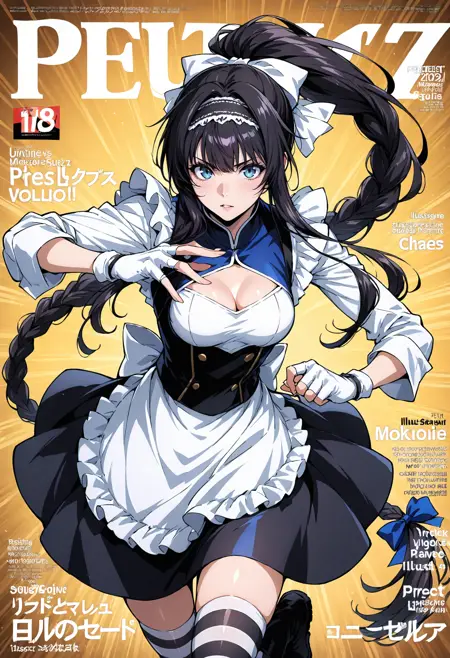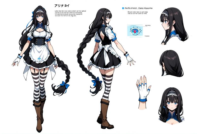 Event Outfit 3: ponytail,braid,braided ponytail,bow,hair bow,ribbon,hair ribbon,hair ornament,breasts,medium breasts,clothing cutout,cleavage cutout,fingerless gloves,white gloves,frills,dress,apron,gloves,thighhighs,striped thighhighs,striped,boots