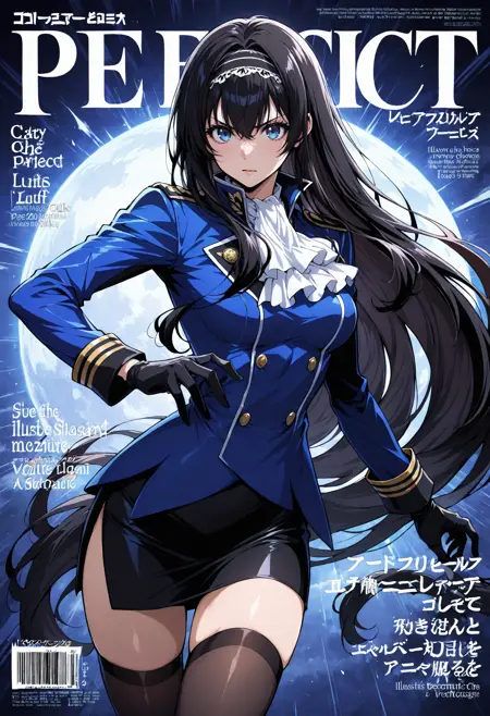 Outfit 4: v-shaped eyebrows,hair between eyes,bangs,hair intakes,gloves,breasts,medium breasts,uniform,long sleeves,jacket,military uniform,ascot,white ascot,blue jacket,black gloves,skirt,thighhighs,side slit