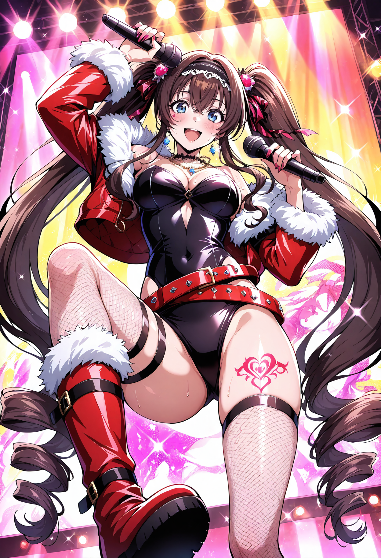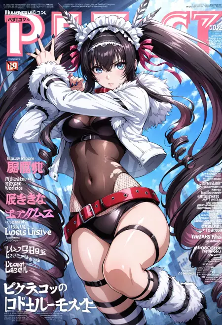 Event Outfit 1: headdress,ribbon,hair ribbon,hair ornament,feather hair ornament,multicolored hair,twintails,hair between eyes,curly hair,drill hair,sidelocks,bangs,jewelry,breasts,medium breasts,nail polish,crop top,bodysuit,collar,jacket,white jacket,fur-trimmed sleeves,open jacket,long sleeves,open clothes,torn clothes,fur trim,belt,red belt,thigh strap,bow,shorts,midriff,thighhighs,striped thighhighs,striped,fishnets,panties,underwear,black panties,leotard,leg warmers,socks,boots,knee boots,chain