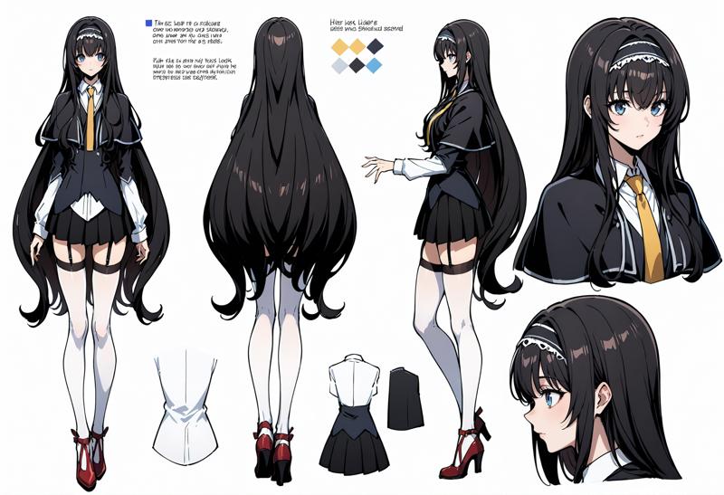 Outfit 1: necktie,yellow necktie,capelet,black capelet,school uniform,shirt,white shirt,long sleeves,skirt,miniskirt,black skirt,pleated skirt,garter straps,zettai ryouiki,thighhighs,white thighhighs,shoes,high heels,red footwear