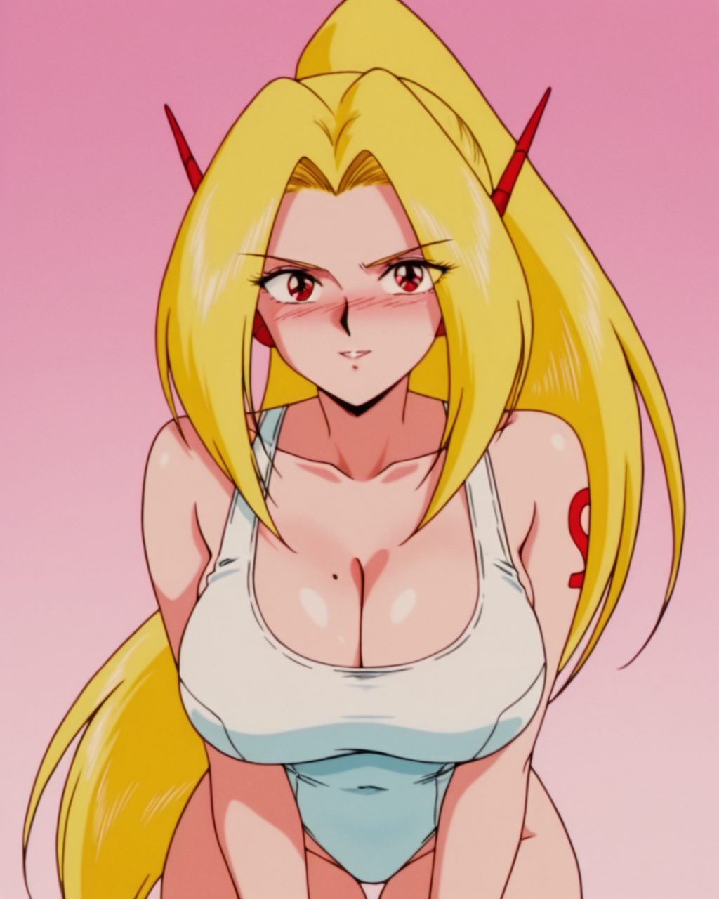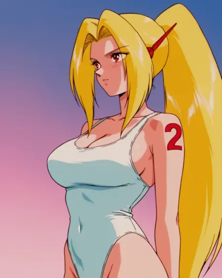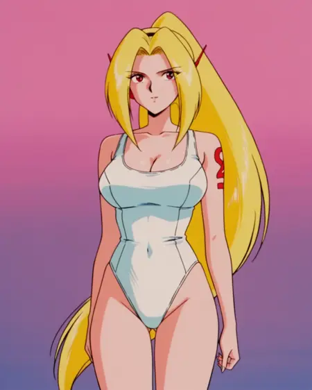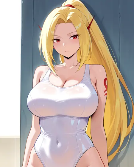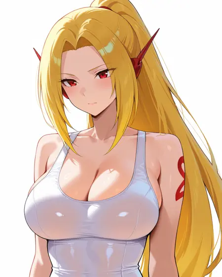 • Teresa, 금발, 붉은 눈, 머리 양쪽에서 늘어선 두 개의 긴 붉은 촉수, 1girl, 솔로, 긴 머리, 문신, 꼬리, 매우 긴 머리, 가슴, 레오타드, 흰 수영복, 원피스 수영복, 흉선