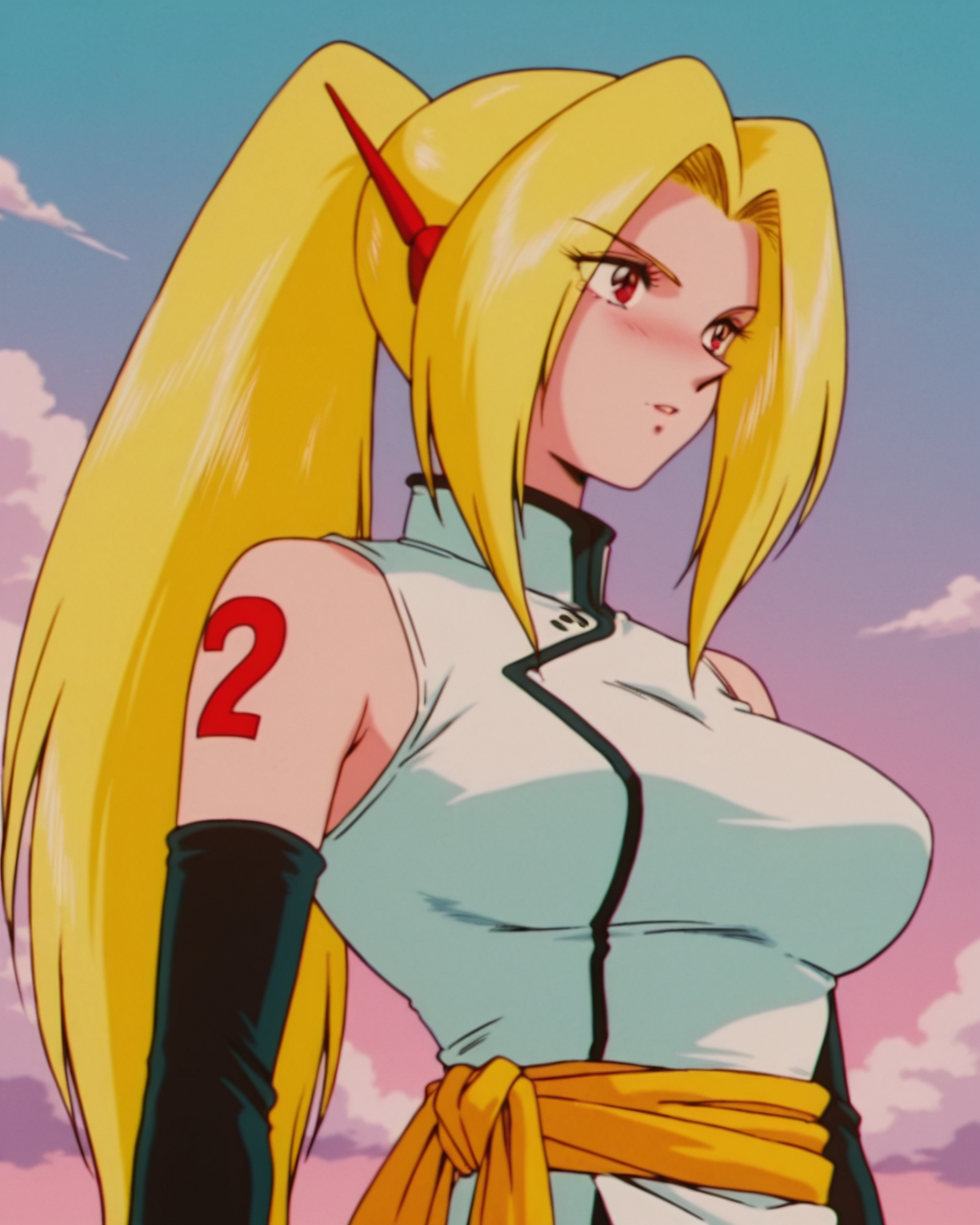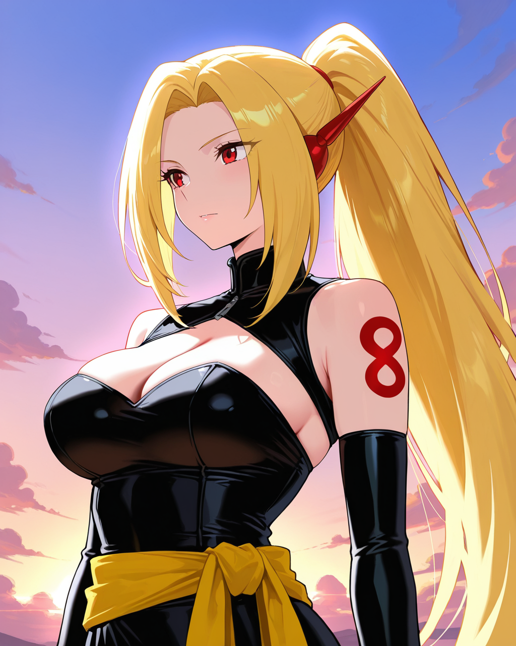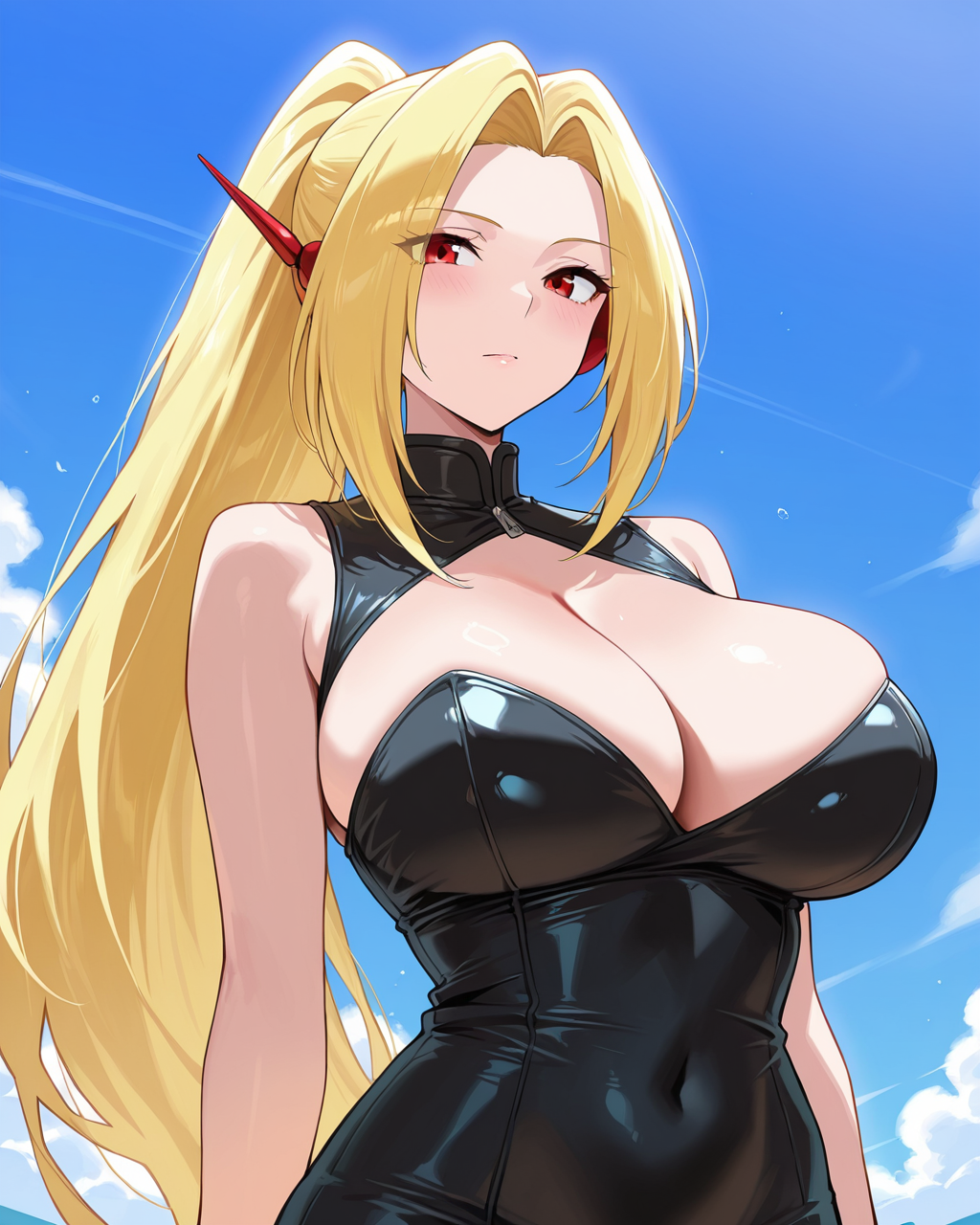 • Teresa, 금발, 붉은 눈, 머리 양쪽에서 늘어선 두 개의 긴 붉은 촉수, 1girl, 솔로, 긴 머리, 문신, 꼬리, 장갑, 매우 긴 머리, 하늘, 가슴, 팔꿈치 장갑, 스카프, 구름, 어깨 노출