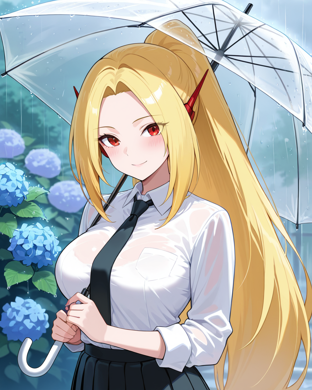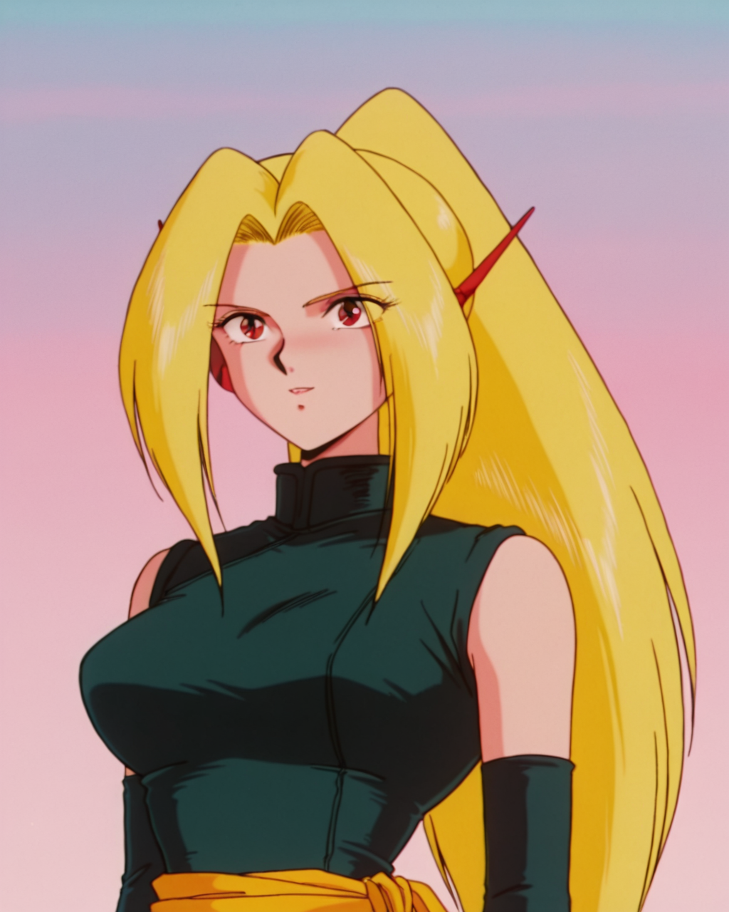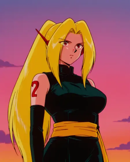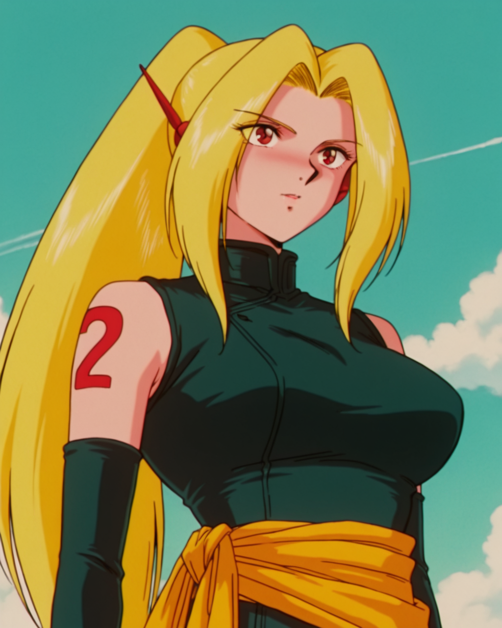 • Teresa, 금발, 붉은 눈, 머리 양쪽에서 늘어선 두 개의 긴 붉은 촉수, 1girl, 솔로, 긴 머리, 문신, 꼬리, 장갑, 매우 긴 머리, 하늘, 가슴, 팔꿈치 장갑, 스카프, 구름, 어깨 노출