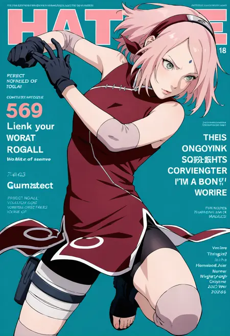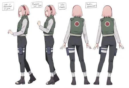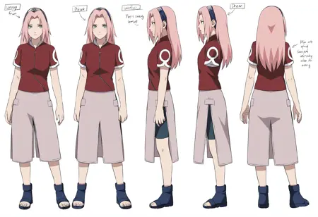 衣装1: ヘアバンド、額の保護具、木ノ葉隠れのシンボル、肩出し、シャツ、赤いシャツ、ノースリーブ、ジッパー、ノースリーブシャツ、ジャケット、ノースリーブジャケット、スカート、ピンクのスカート、オーバースカート、手袋、黒い手袋、ショートパンツ、黒いショートパンツ、自転車用ショートパンツ、太ももポーチ、ブーツ、趾なし履物、黒い履物、サンダル、太ももストラップ