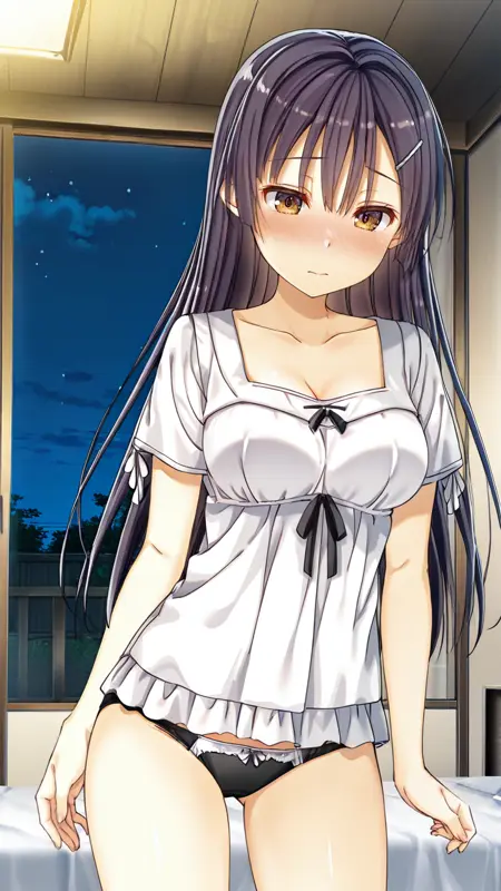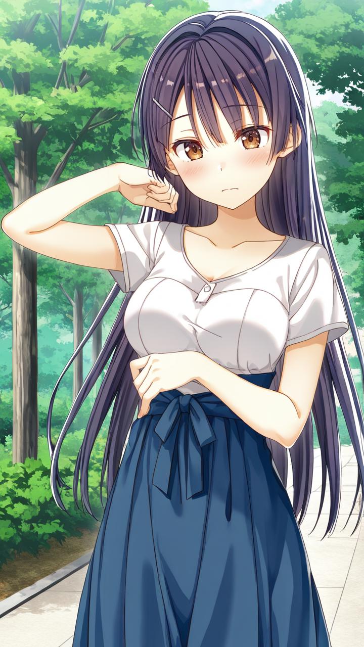 MaiKudo, brown eyes, dark violet hair, long hair, hair bangs, sidelocks, hair clip, medium breasts