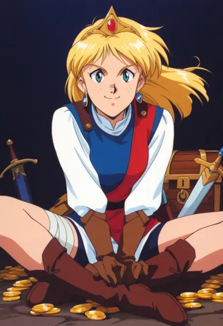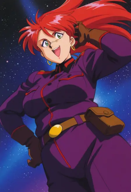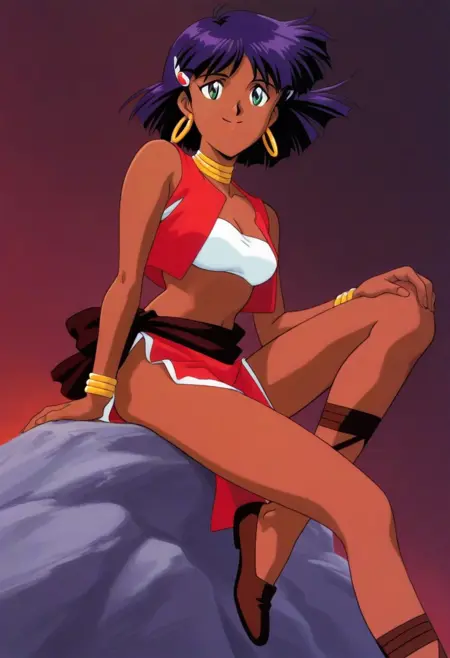 | 训练词汇 | 1990s (style), retro artstyle,已复制! Nddrkgrl, green eyes, purple hair, short hair, bangs, hair behind ear, dark-skinned female, hoop earrings, hair ornament, neck ring, golden bracelets, open vest, bandeau, waistband, red pelvic curtain, brown flats, 1girl,已复制! |