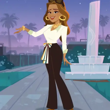 TAGS: Melrose_ProudFamily, full body, latina, brown skin, long brown hair, big hoop earrings, sunglasses on head, confident smile, slanted eyes, fashionable, stylish outfit, white blouse, long sleeves, black dress pants, wide pants, ribbon belt, golden necklace