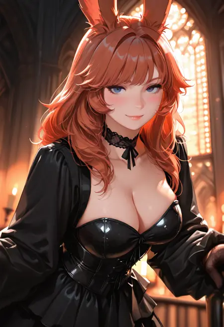elvara, viera, bunny_ears, auburn_hair, blue_eyes, black_eyeshadow, large_breasts
