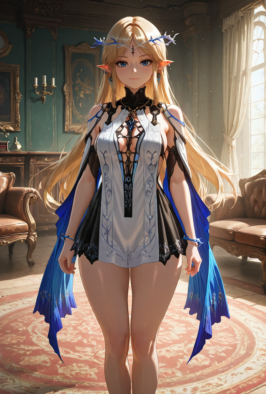 cartethyia, crown of thorns, pointy ears, blue eyes, blonde hair, parted bangs, forehead mark, long hair, earrings, black collar, necklace, white tabard, black dress, bracelet,