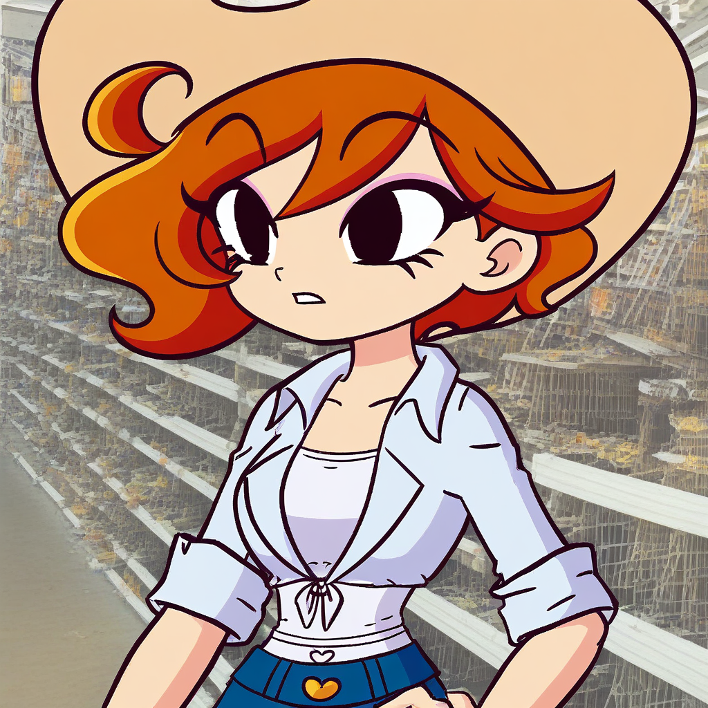 beige cowboy hat, light blue knotted blouse, white t-shirt, jeans,