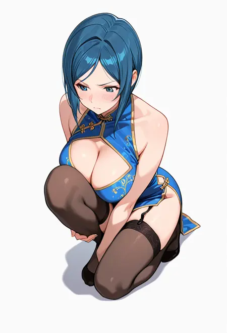 sanae_cnr, 1girl,blue eyes, blue hair,large breasts,mature female, short hair,