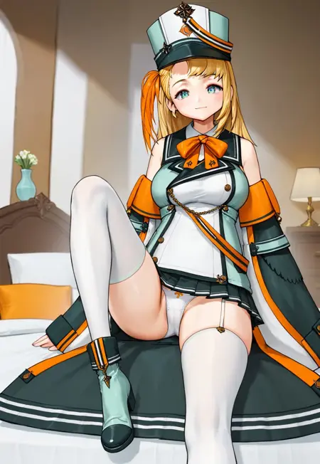 Pina2, 1girl, solo, 长发, 看着观众, 刘海, 蓝眼睛, 裙子, 金发, 过膝袜, 长袖, 帽子, 靴子, 虚拟YouTuber, 白色过膝袜, 袖子超过手腕, 一侧抬起, 橙发, 军帽