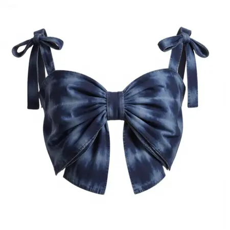1、黒いデニムのカロップトップを着た女性。中央に大きなリボンがあり、両側にはリボンで結んだストラップが付いています。