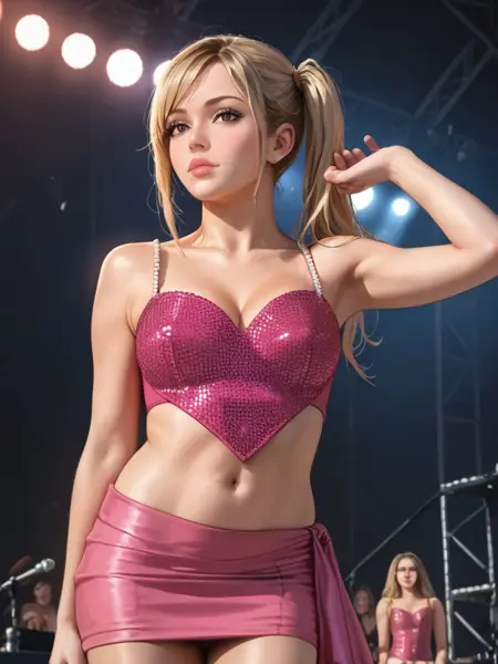 萨布丽娜·卡彭特在拉拉帕鲁扎演出中穿着的粉色爱心上衣、裙子和靴子搭配。