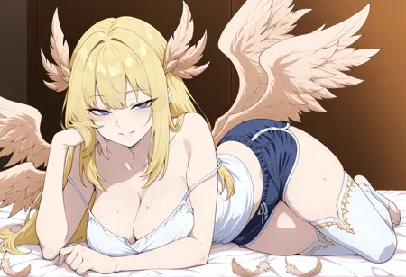 金髪、青い目、長い髪、羽根の髪飾り、頭部防具、鎧、胸甲、裸の肩、十字架、肩当て、手甲、外側の袖、レオタード、追加の翼、翼、脛当て、