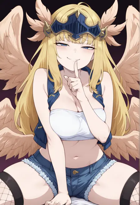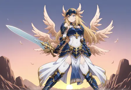 金发、蓝眼、长发、羽毛发饰、头盔、盔甲、胸甲、裸露肩膀、十字架、肩甲、护手、分离袖子、紧身衣、额外翅膀、翅膀、小腿甲、