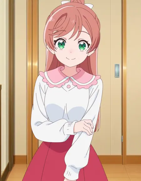 动漫截图,单人,1女孩,nijigaokamashiro,mashirowinter,长袖,丝带,粉色领子,荷叶边领子,粉色荷叶边,白色毛衣,红色裙子,lora:nijigaokamashiro_IL:0.8 高清晰度,卓越画质,最佳画质,非常唯美,杰作,absurdres,