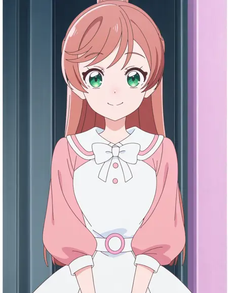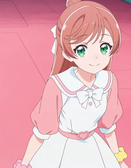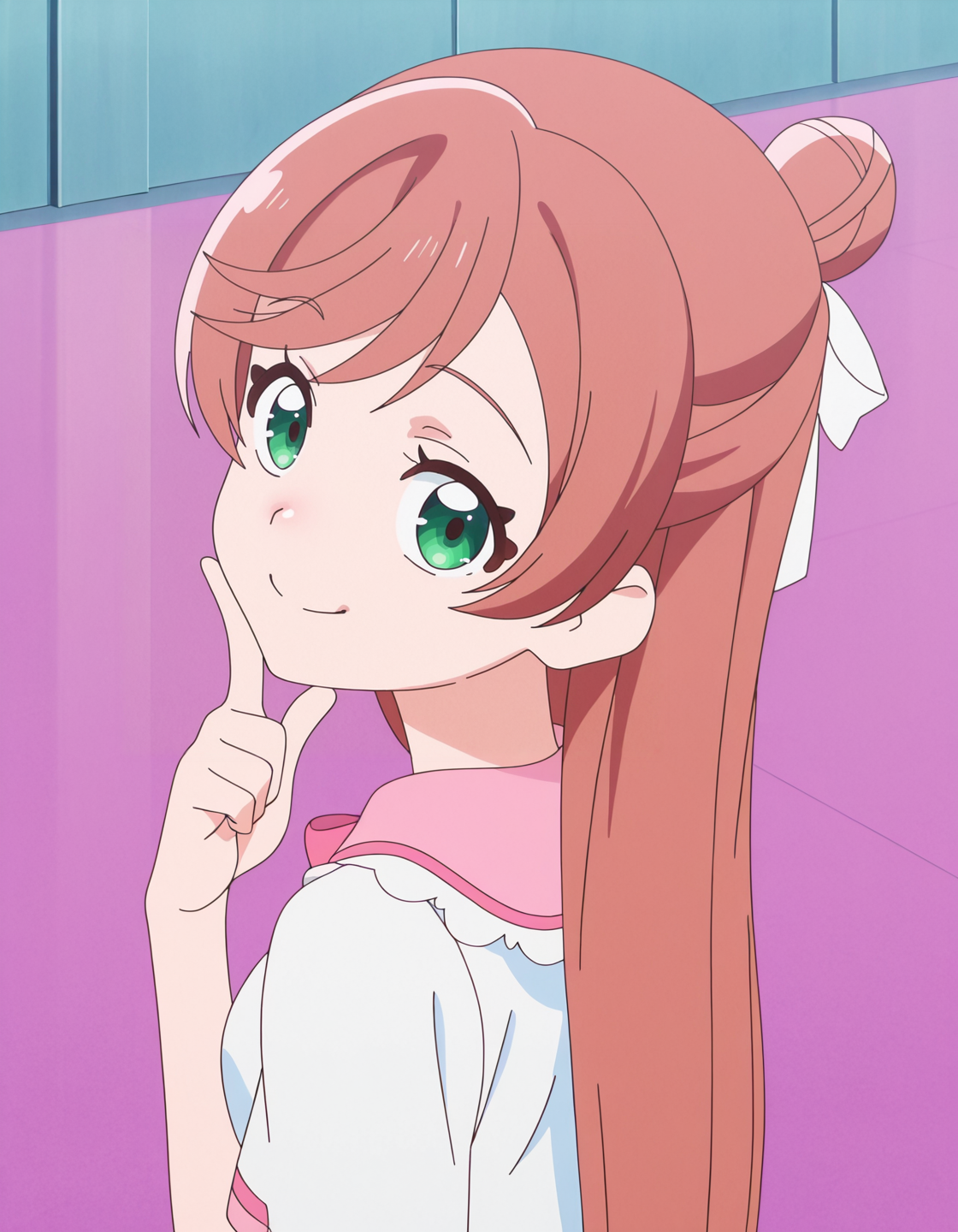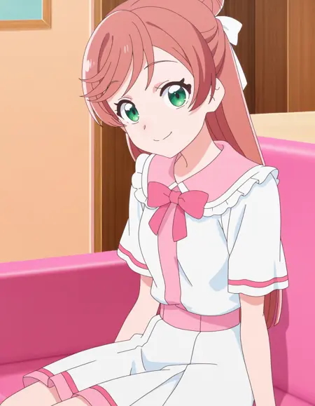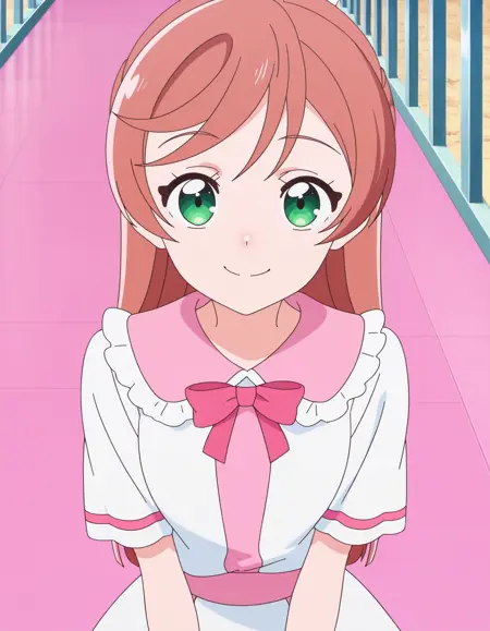动漫截图,单人,1女孩,nijigaokamashiro,mashirosummer,短袖,丝带,粉色蝴蝶结,粉色领子,荷叶边领子,lora:nijigaokamashiro_IL:0.8 高清晰度,卓越画质,最佳画质,非常唯美,杰作,absurdres,