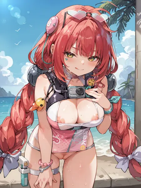 「Tanuki in Broad Daylight」(水着)用追加プロンプト: 顔の模様、シングル、ツインブラids、メガネを頭にのせる、サングラス、ピンクのヘアポッド、ヘアボブ、胸ハーネス、ドレス水着、腕リボン、ビーズブレスレット、リストバンド、大腿ホルスター、足の包帯、アンクレット、ハイヒールサンダル