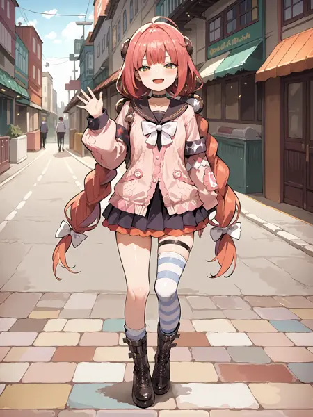 デフォルト衣装用追加プロンプト: ツインブラids、茶色のヘアポッド、ヘアボブ、黒いチョーカー、黒いセーラーカラー、白いボウタイ、ピンクのカーディガン、腕バンド、レイヤードスカート、大腿ストラップ、ストライプの片側太ももハイ、ストライプの片側膝上ハイ、膝上ブーツ